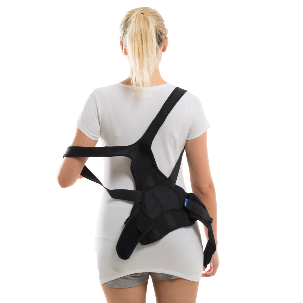 The Mediroyal EXTO‚ Light has been specially designed for improving posture and aiding with Osteoporotic pain and alignment. Its easy to apply with the same application design as a back-pack. The complete design has been patented and consists of several semi-elastic areas, made of a thin, elastic and breathable membrane textile that has been stitched together. Over the shoulder area there is a soft and comfortable material to prevent irritation. The thoracic area has a Y-shaped part that assists extension effectively. The lower works as a lumbar support with silicone strips on the inside to prevent migration. The shoulder straps are linked to two nylon straps that are hidden inside the design to provide a high friction, making it easy to adjust the extension support without much force. The design has also been fitted with a low profile hook that makes a good grip onto the material. Special tabs have been added to all the hook straps to make opening easier.